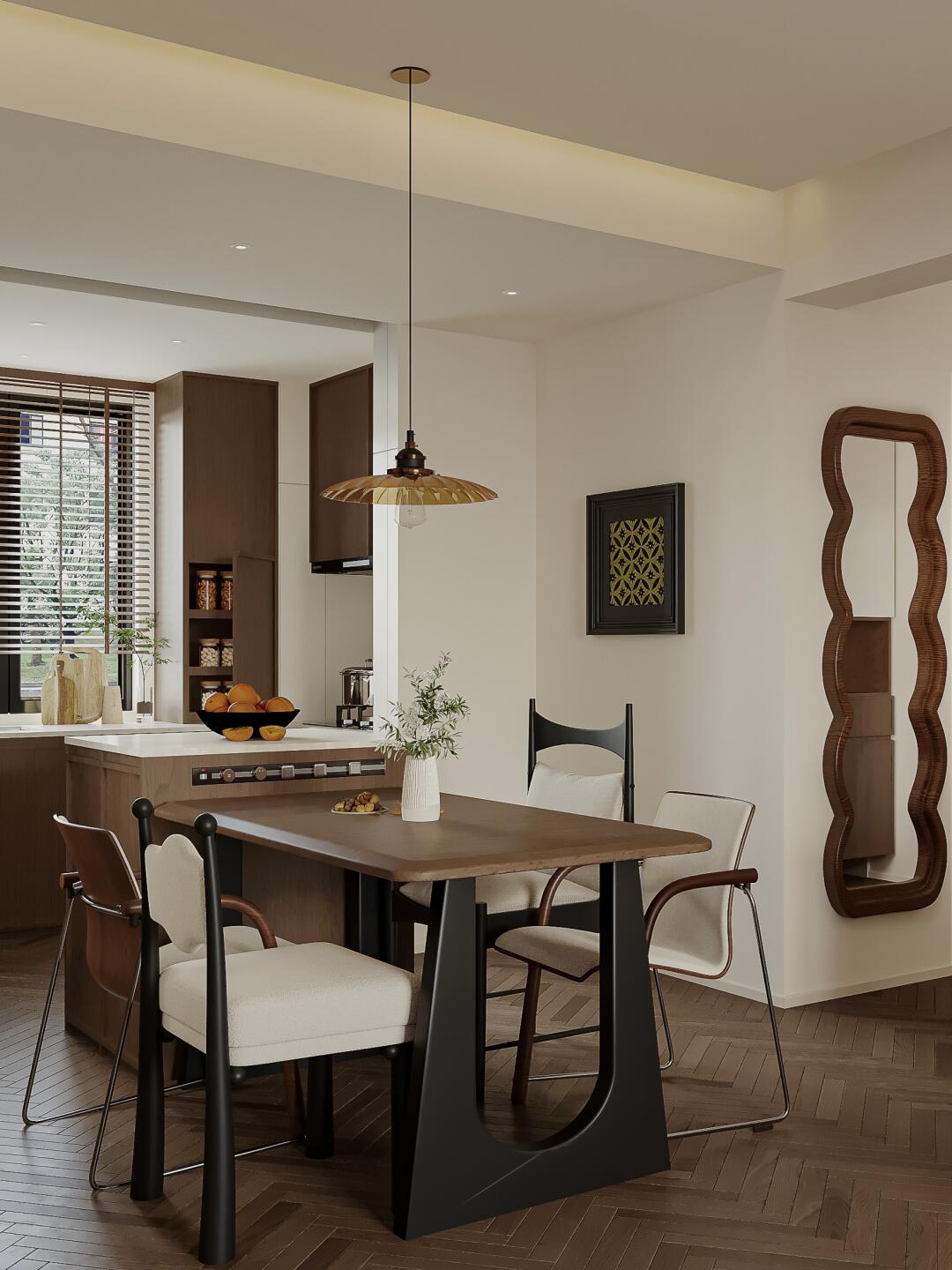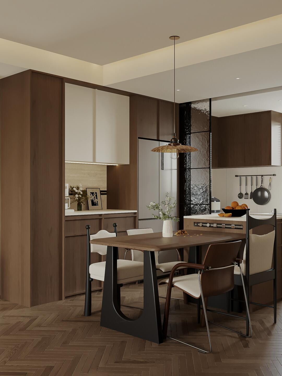 餐廳復古胡桃木色+黑色,配以淺色柔和藝術漆,視覺舒適度up!!!中古氛圍感滿滿~