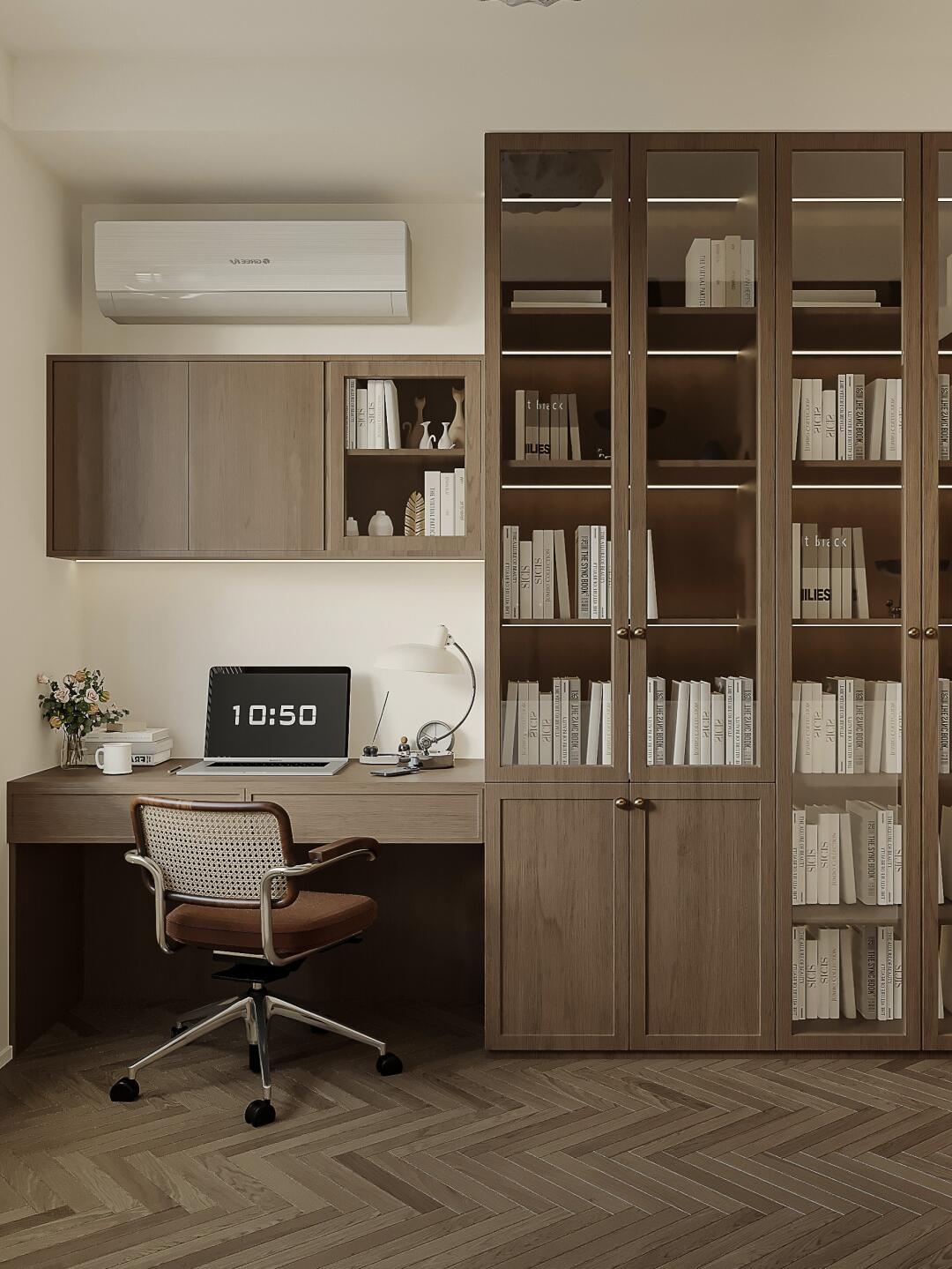 靠窗一側做書桌+書柜,滿足日常辦公和閱讀需求;