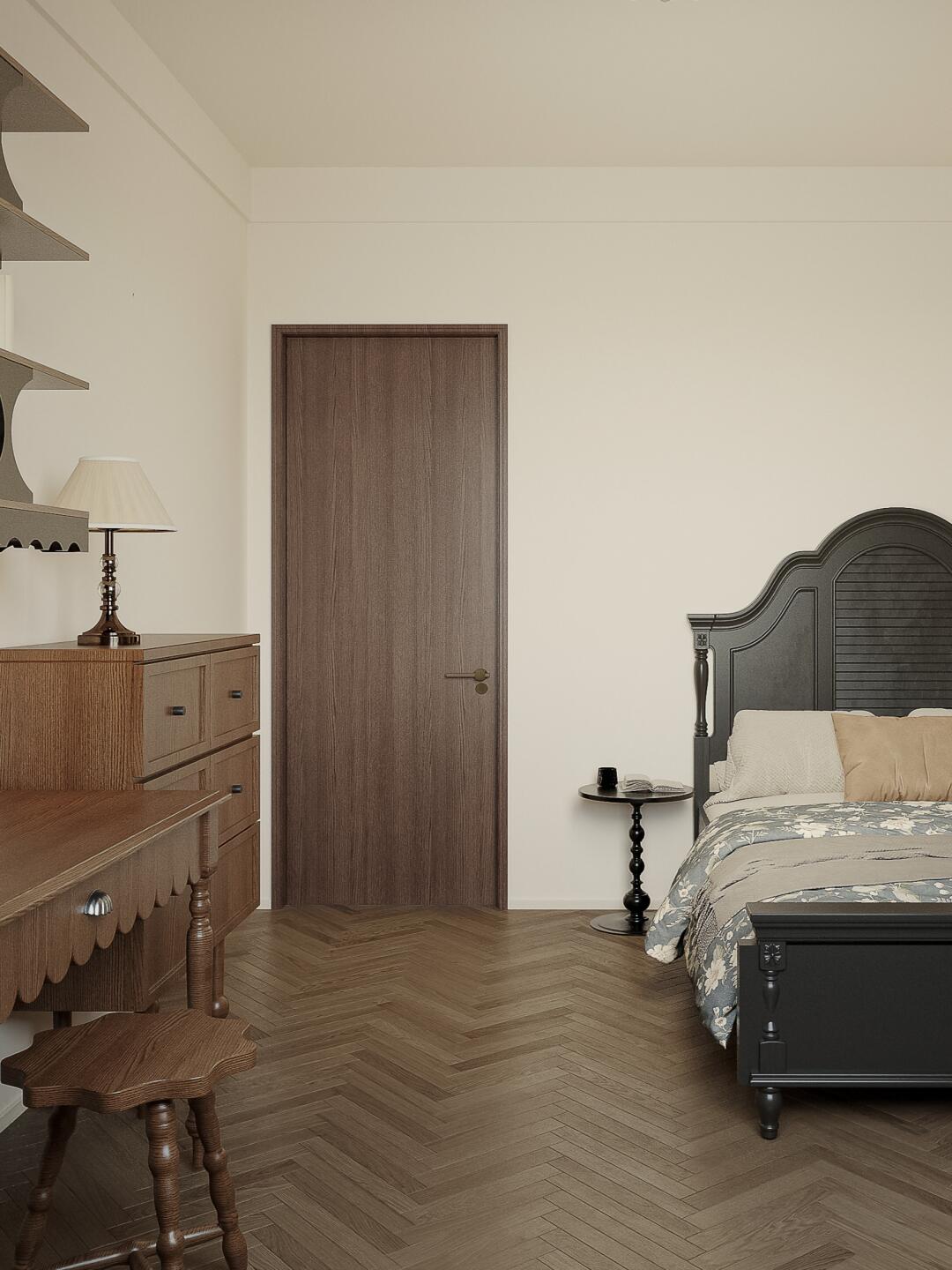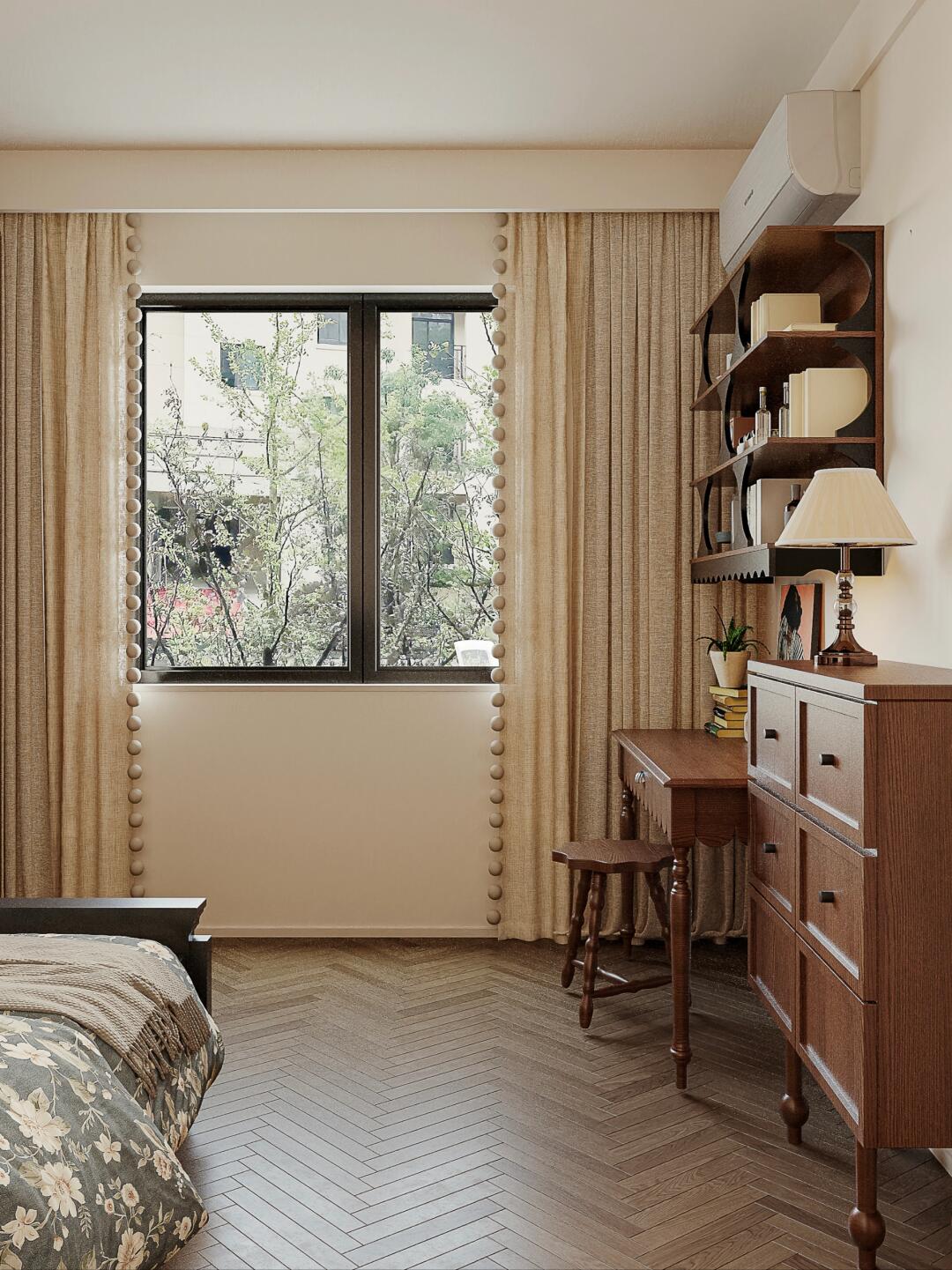 臥室做奶油色墻面,溫柔包裹整個空間,打造舒適靜謐的居住環境。棕色半墻床頭背景,層次分明,同時又增加了空間的復古氛圍。