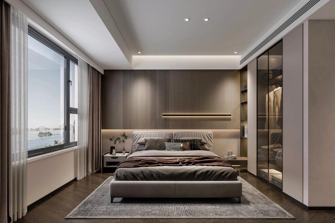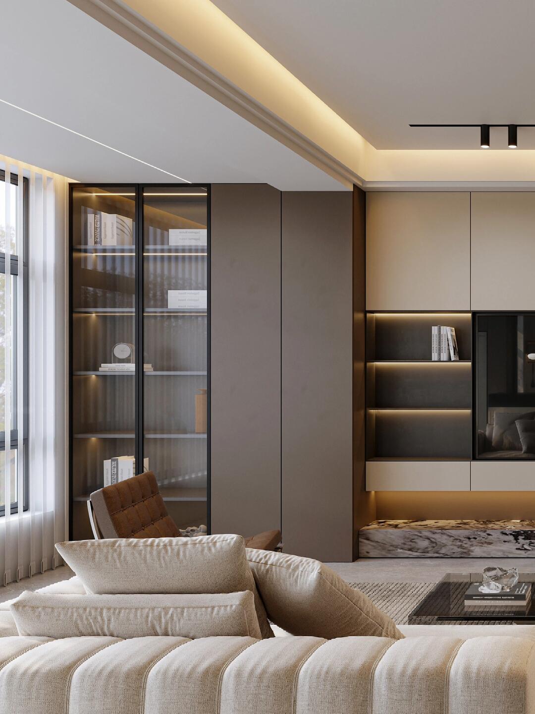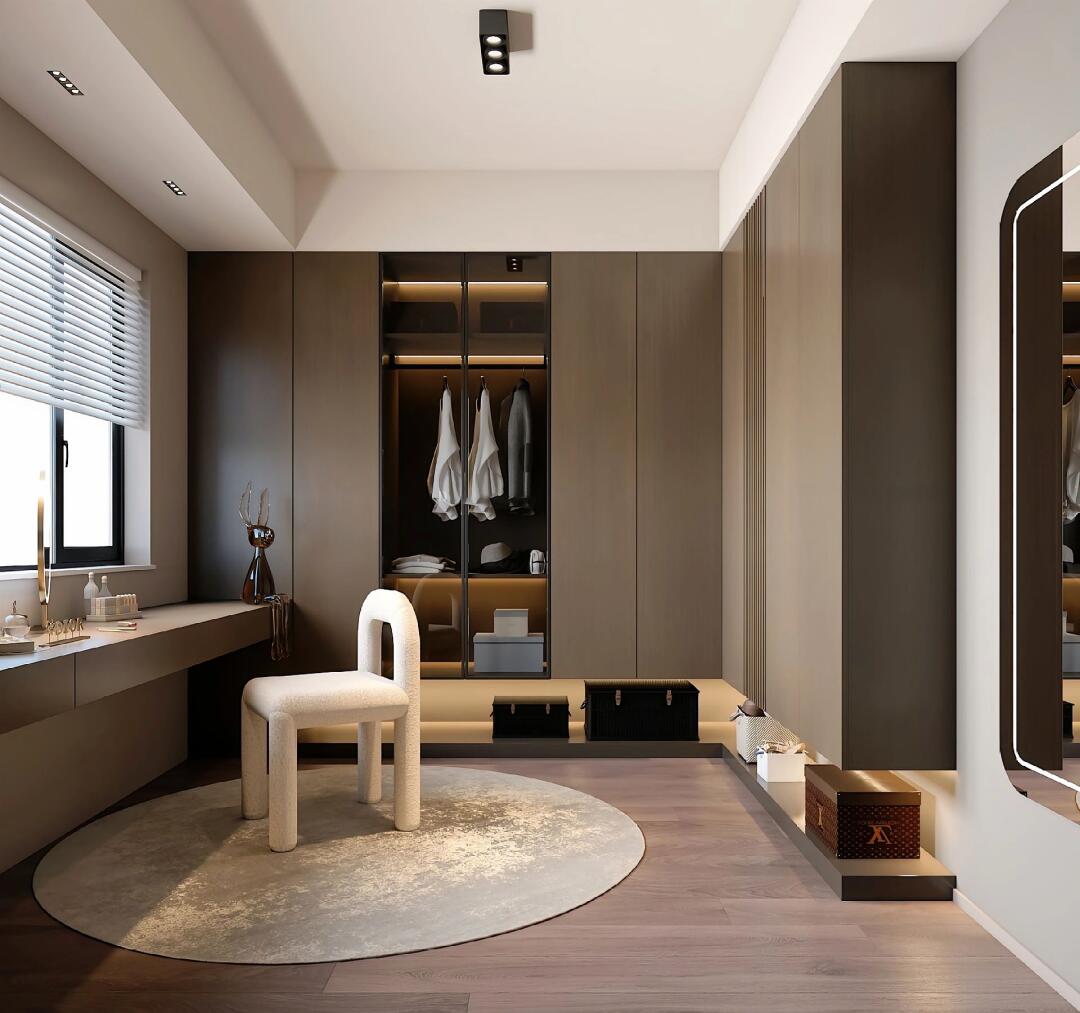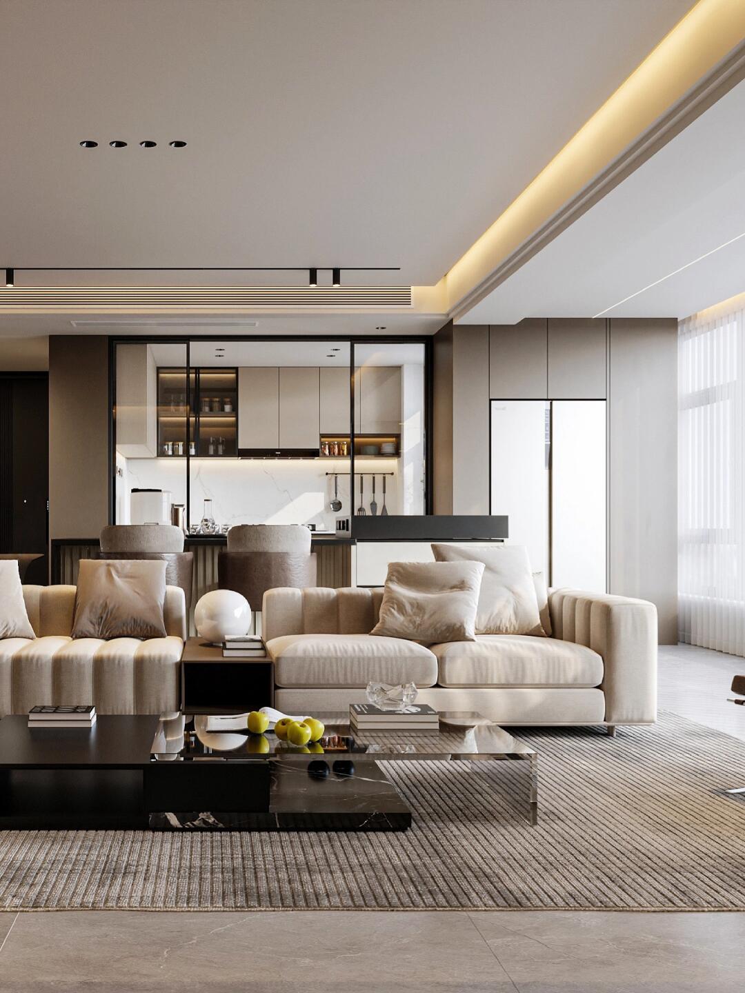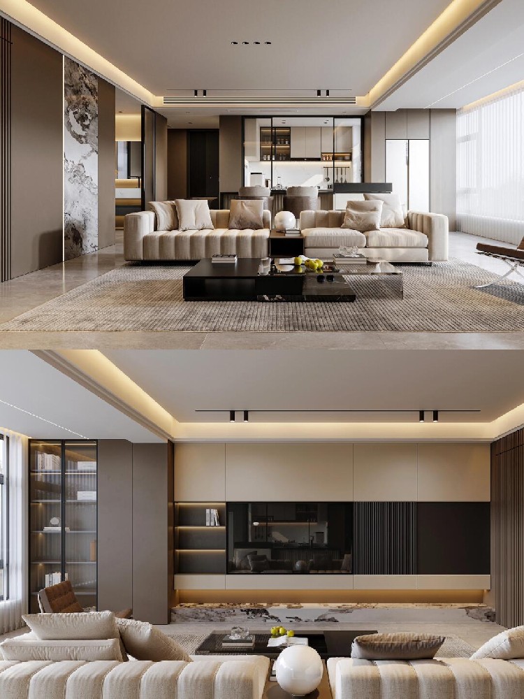 本案整體以意式輕奢風(fēng)為主,強(qiáng)調(diào)空間的通透與舒適感,色調(diào)上以暖咖系為主基調(diào),