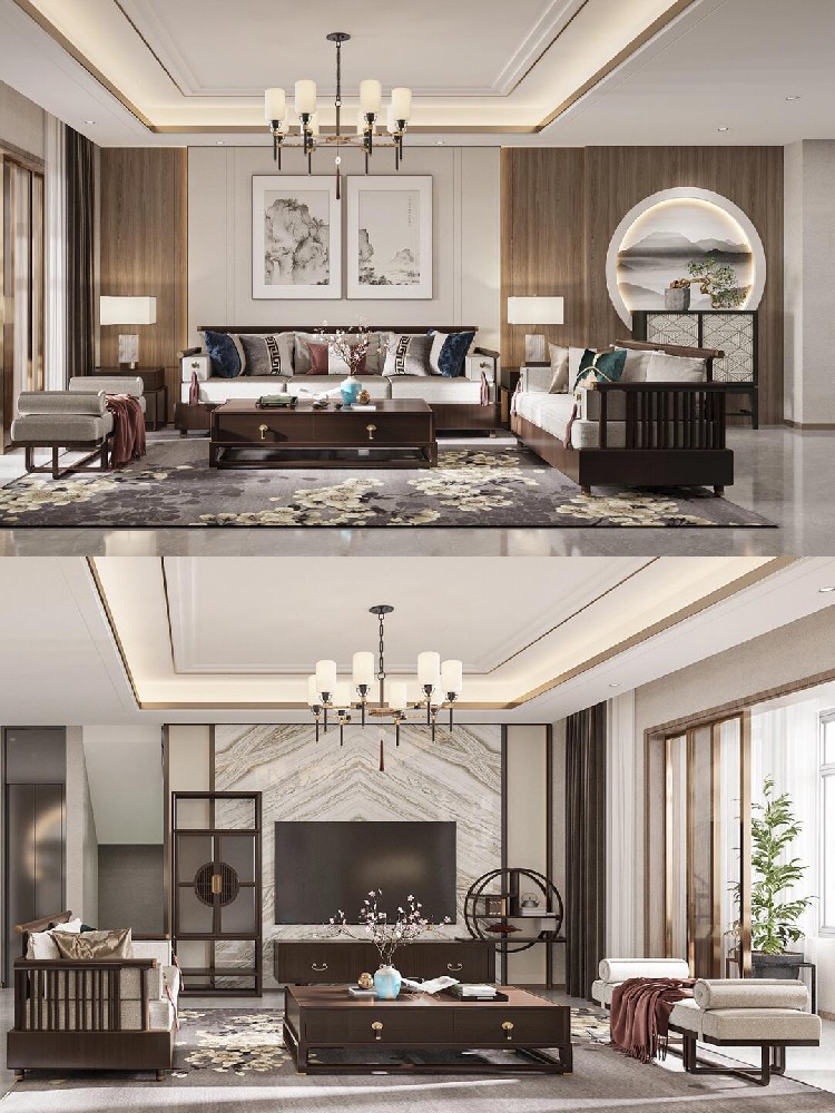 以米色為主色調(diào),選用咖色飾品作為點綴,柜體采用木飾面搭配玻璃材質(zhì),以金屬線條收邊。