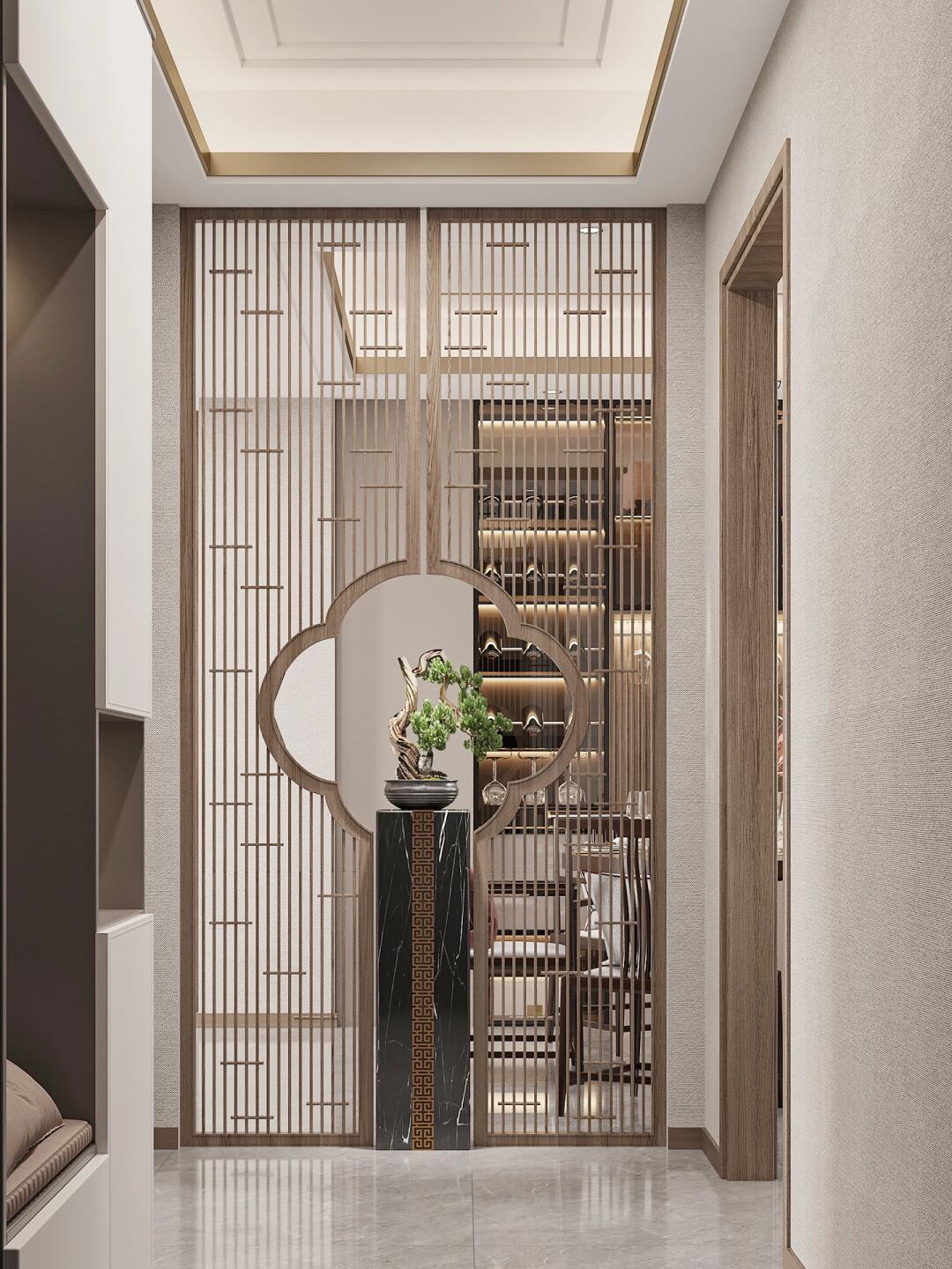 本身空間狹小且光照不足,在餐廳與門廳之間的選用鏤空木柵欄。