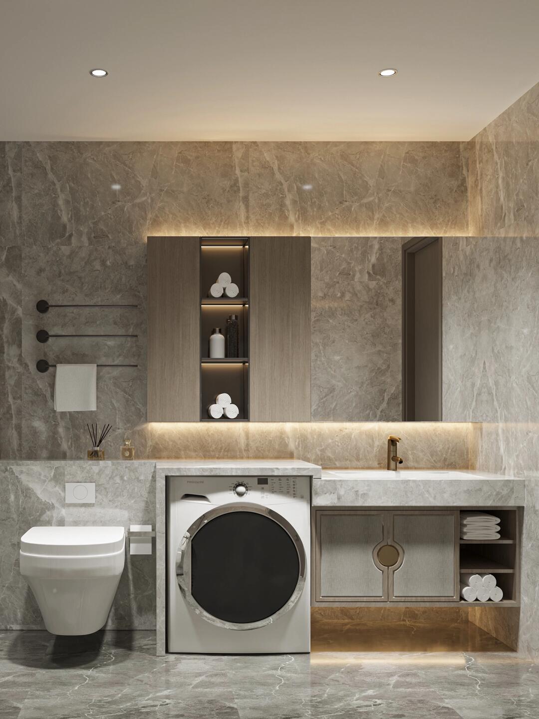 同樣以簡約為主,白色大理石直接上墻,與卡其色柜體銜接。