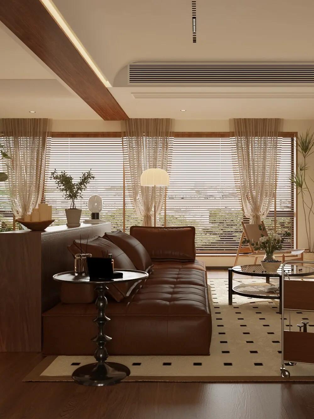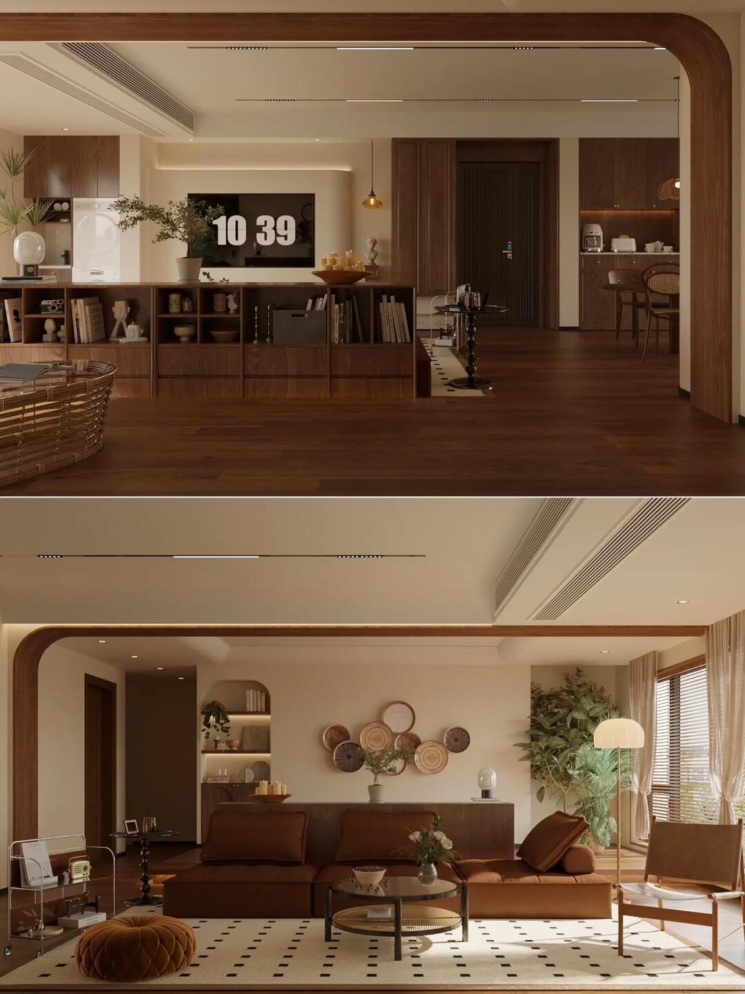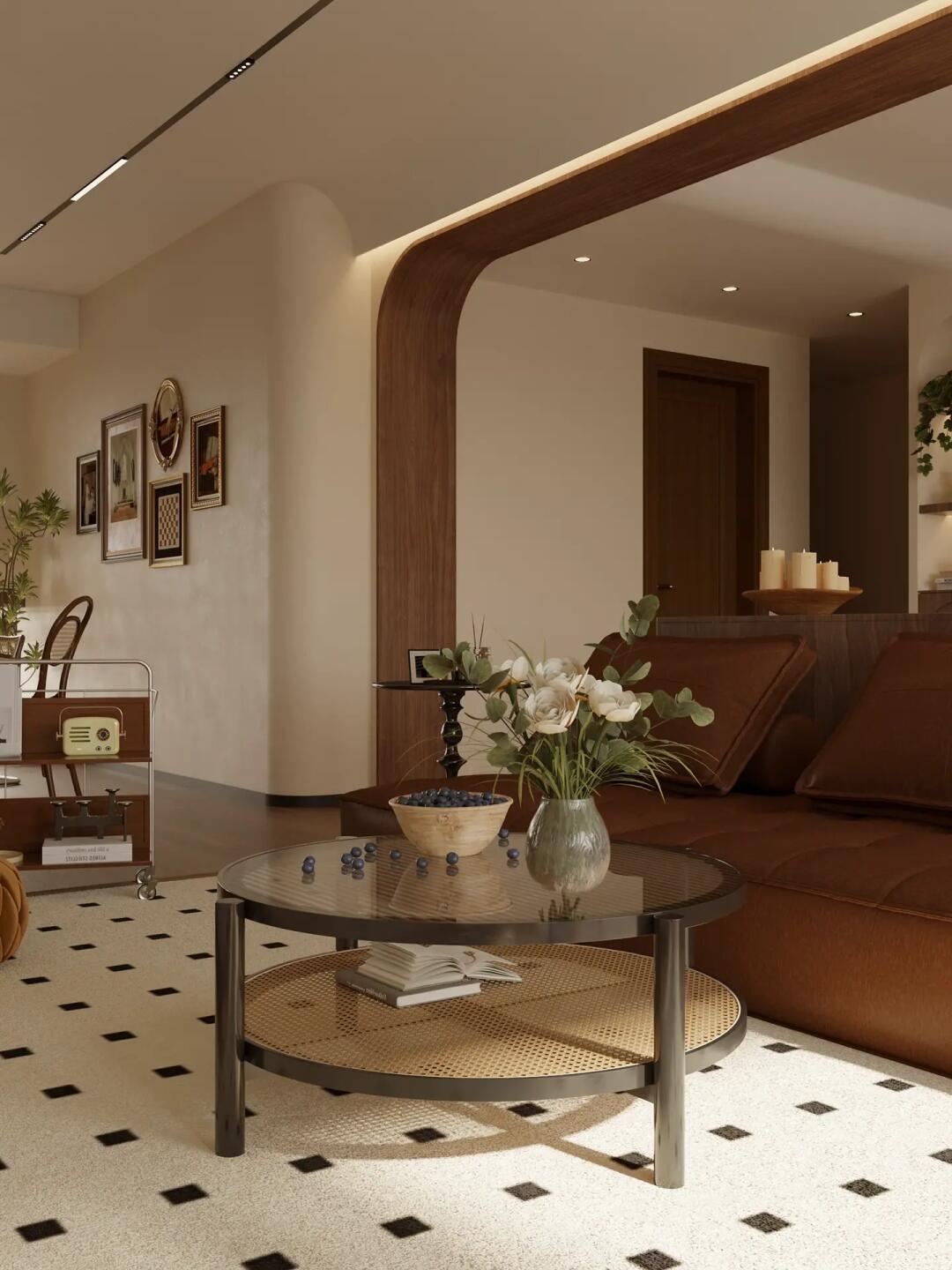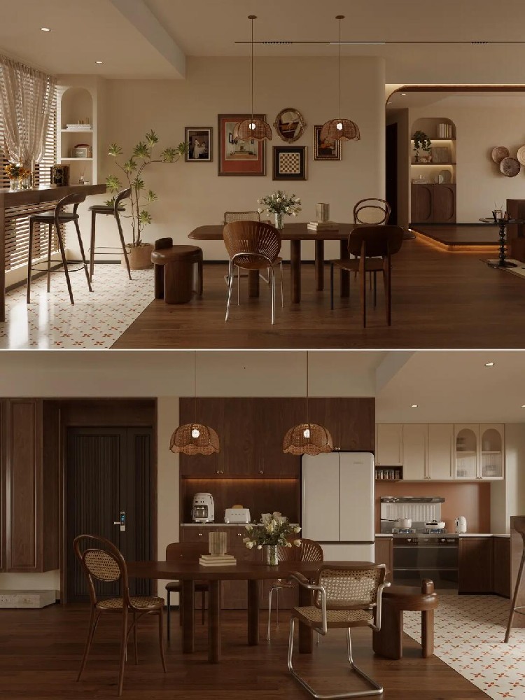 全屋通鋪咖棕色的木紋磚,搭配同色系家具,塑造了格調(diào)滿滿的美式復(fù)古感