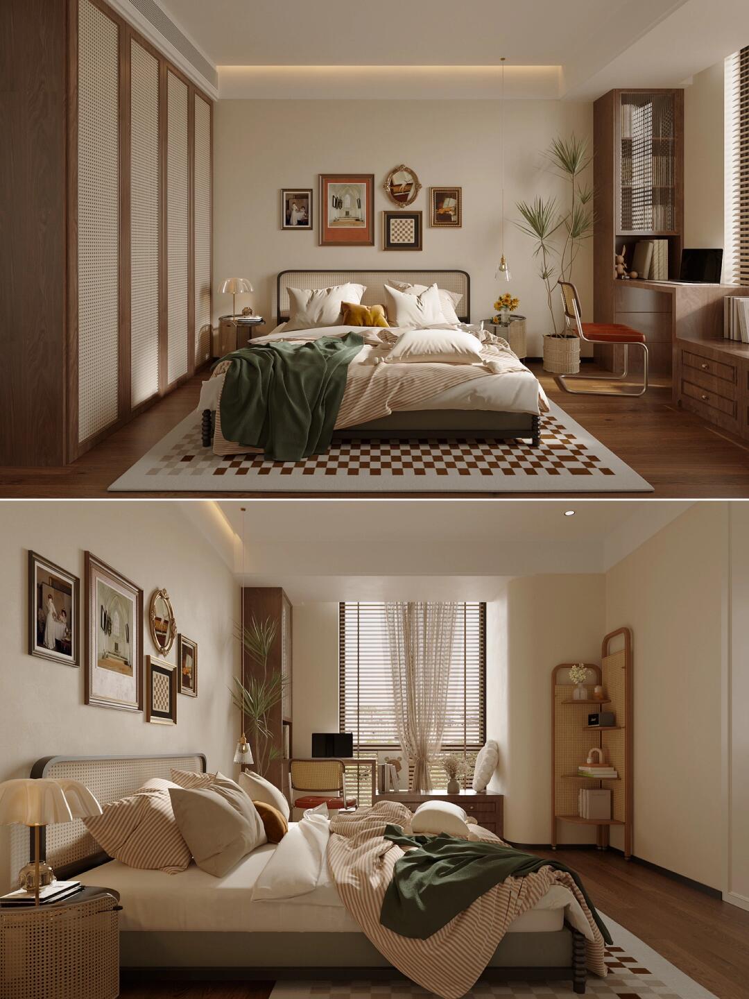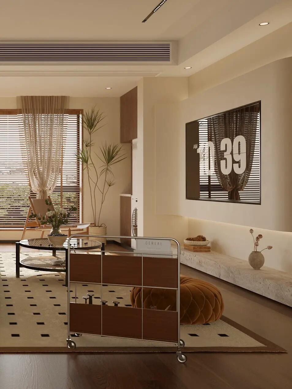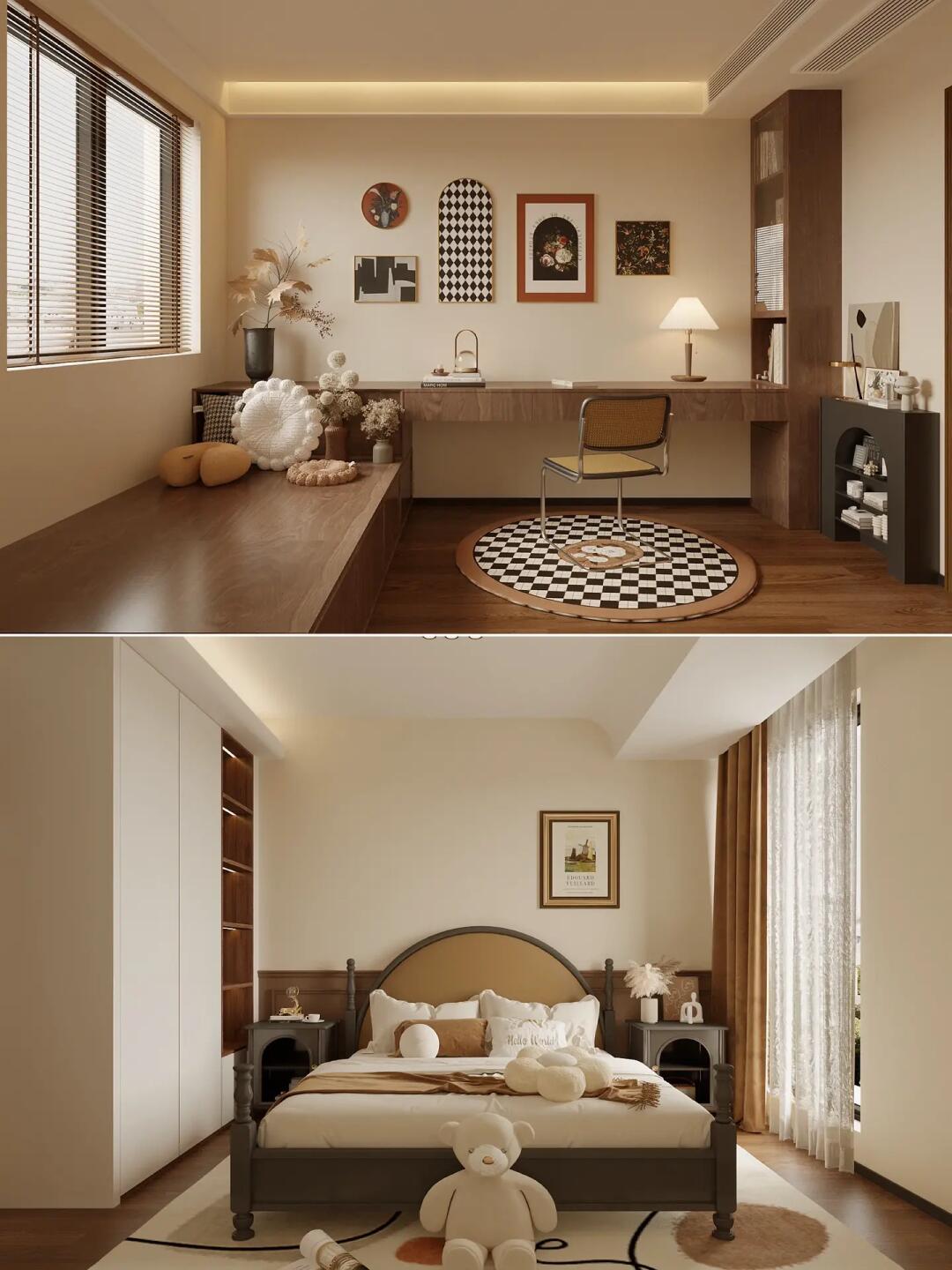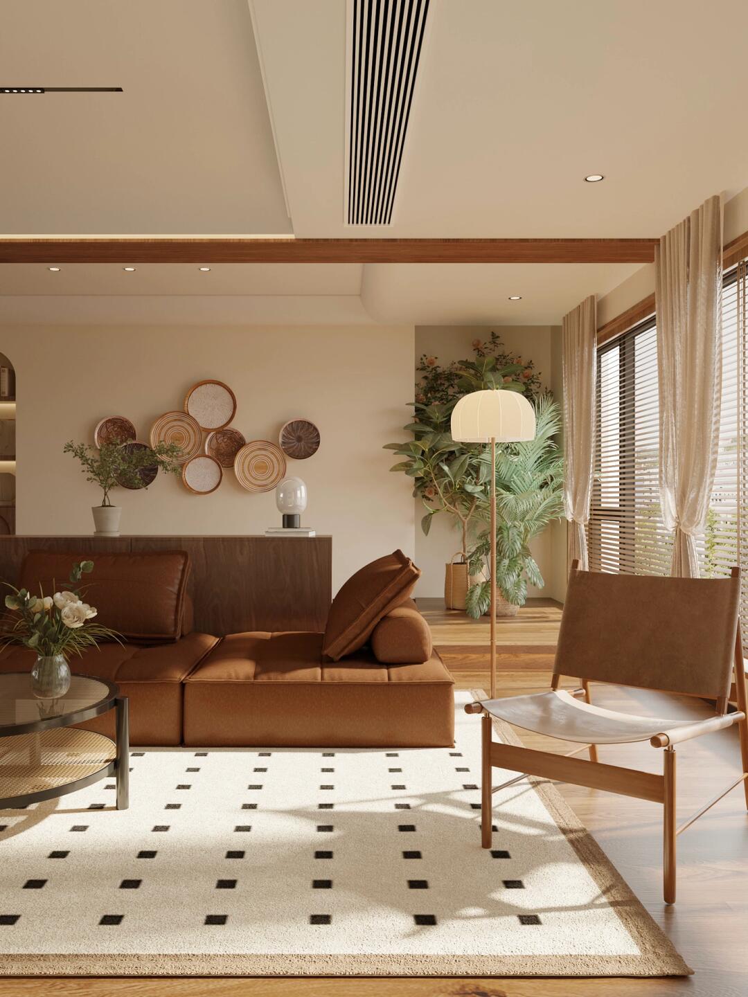 全屋通鋪咖棕色的木紋磚,搭配同色系家具,塑造了格調(diào)滿滿的美式復(fù)古感