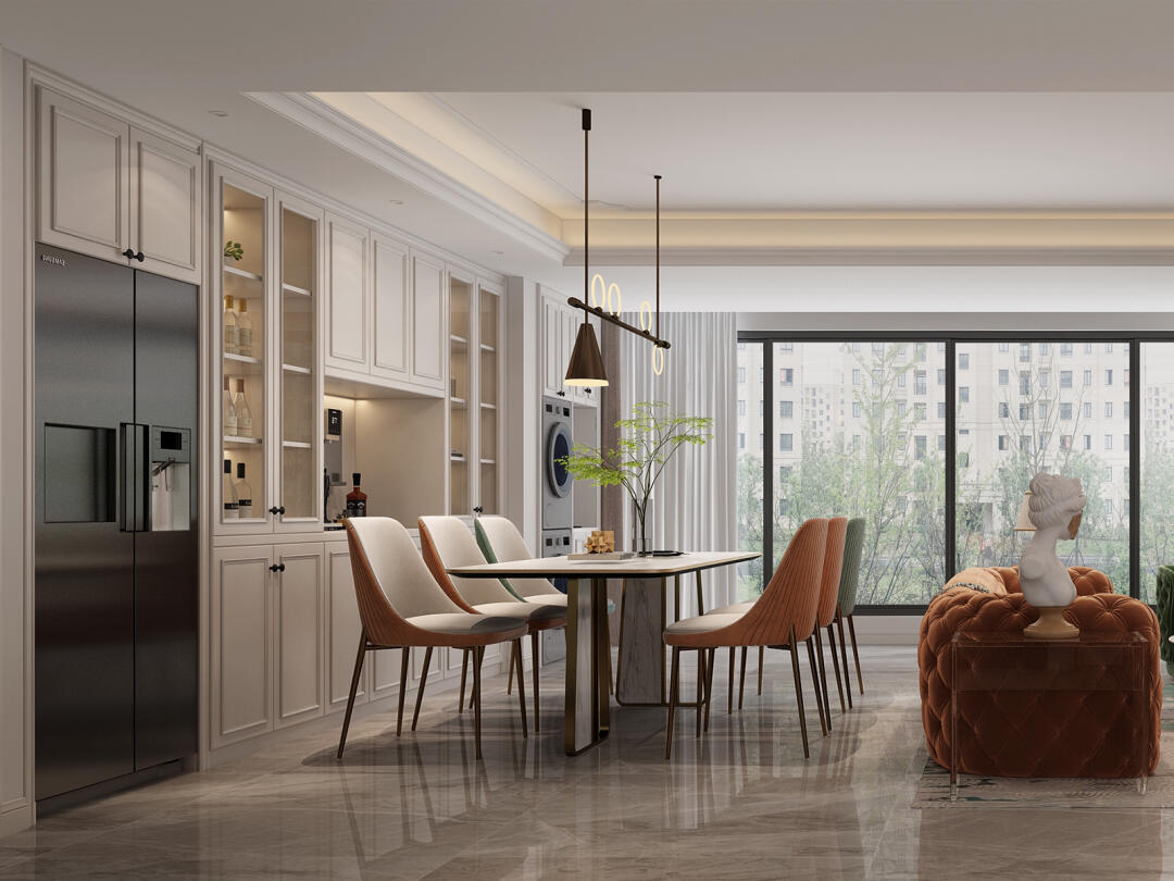 奶白色的大理石餐桌,搭配上幾把皮質(zhì)座椅,
