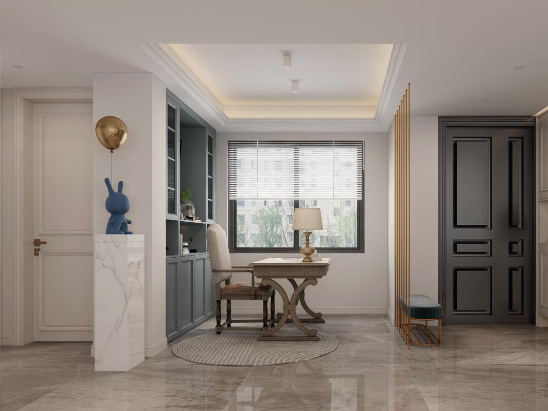 我們把書房做成開放式的和客廳融為一體,讓整個(gè)空間顯示更加通透。