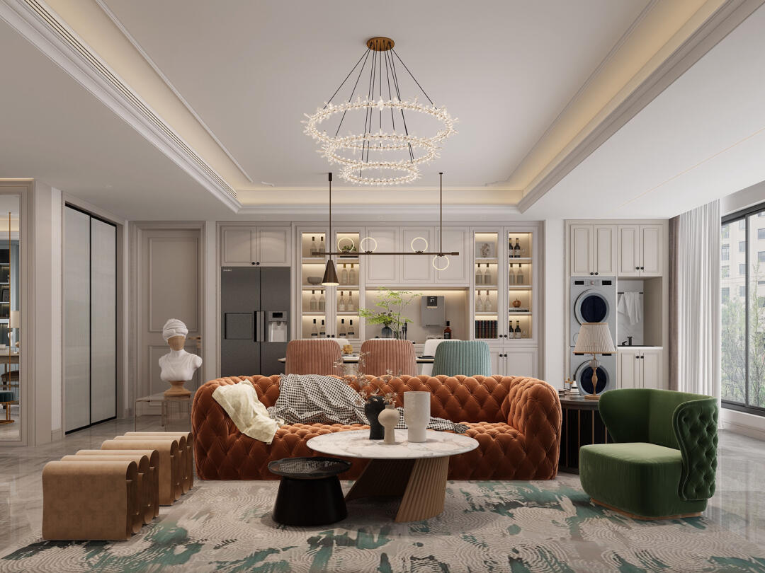 藏綠色的地毯,搭配咖色的沙發(fā),為了營造美式輕奢之風(fēng),