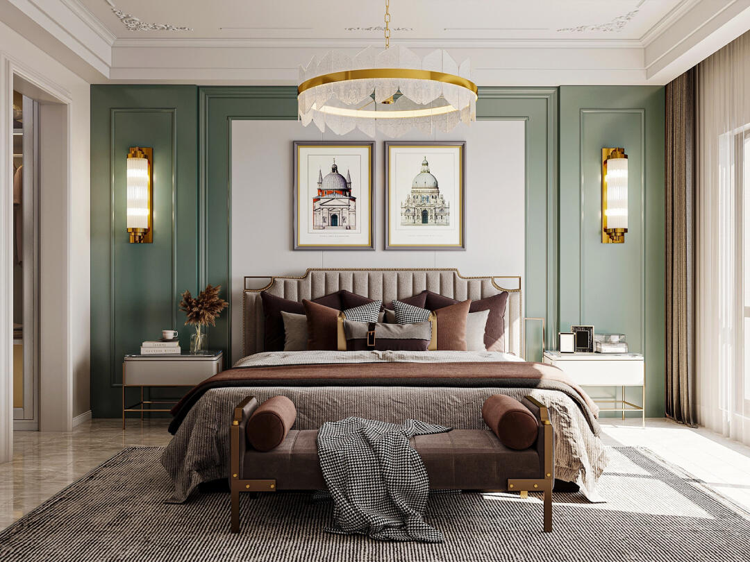 綠色的背景墻,搭配壁燈裝飾,讓整個(gè)空間搭配時(shí)尚又不缺層次感,