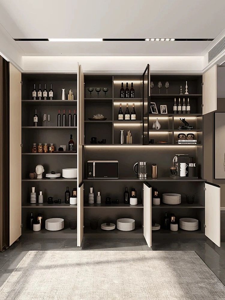 ?收納高柜、玻璃柜、薄吊柜、置物等的多功能設計,分區(qū)功能更實用、有藏有露更高級