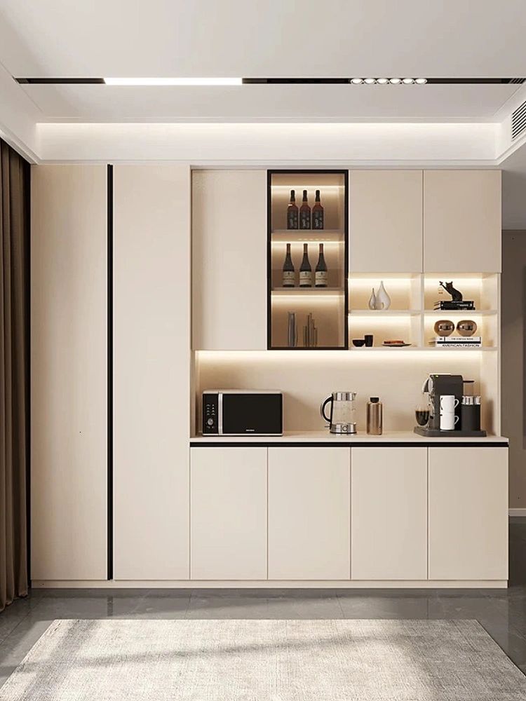 ?餐邊柜做極簡造型,一體成型的隱形設計再搭配上嵌入式燈帶,時尚且高級
