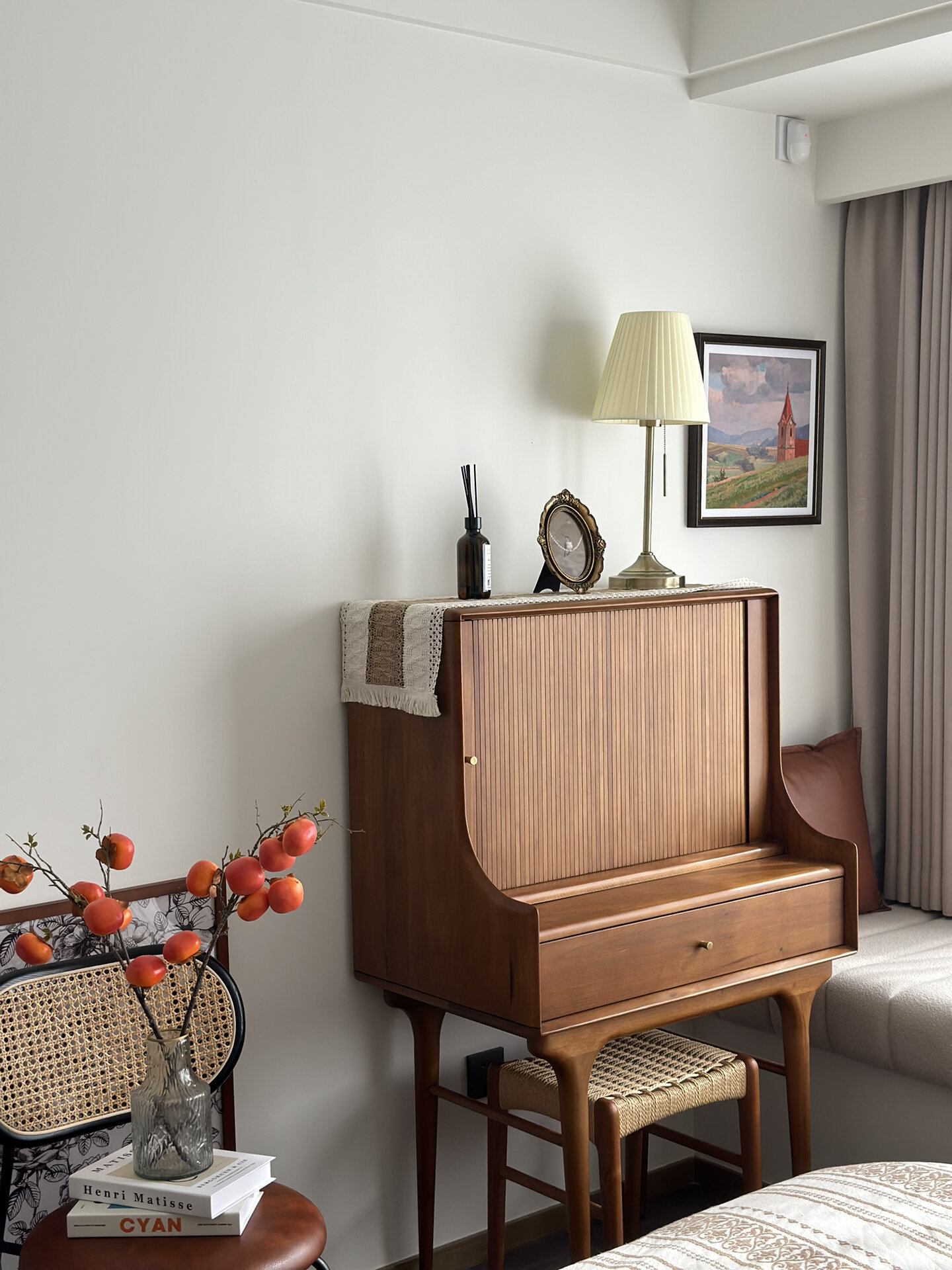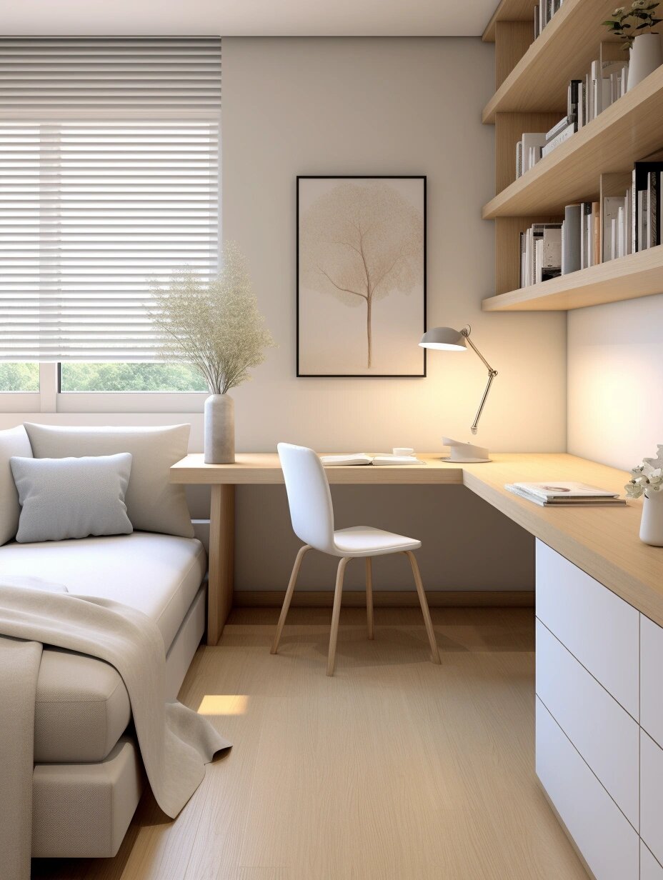 臥室的犄角加桌椅也可做工作區,解決沒空間布置書房的問題,傷腦筋的奇怪角落也可以利用起來了。